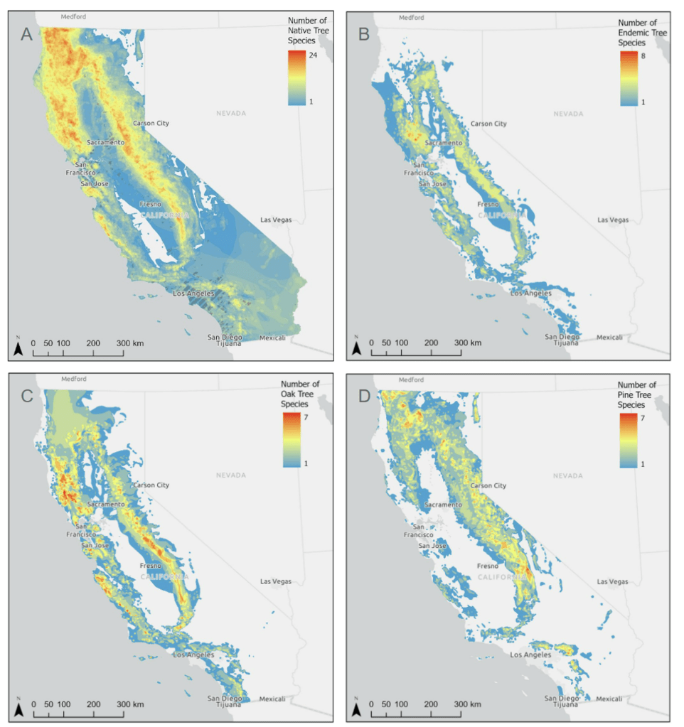 We created high-resolution digital range maps for all of California’s 94 tree species to generate species richness heat maps. We used these data to create locally-native urban tree species lists for each census designated place in California. We found that relatively few species were native to the boundaries of each city. On average, six tree species are native to individual cities in California.