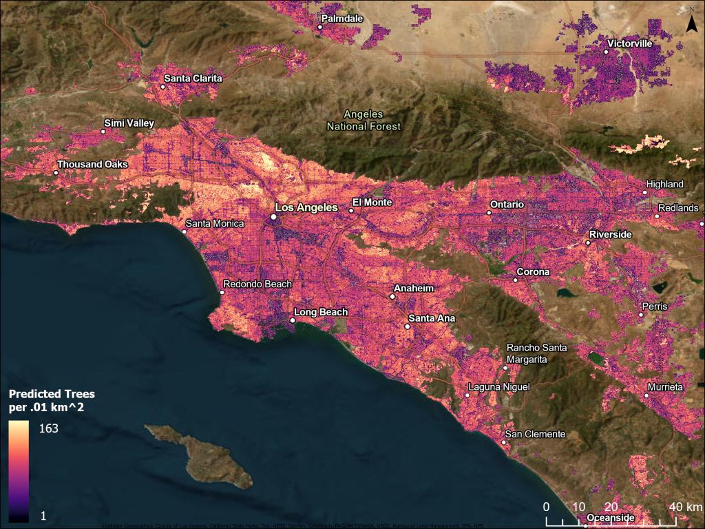 We are using the output from out tree detector tool to assess patterns in tree density and trees per capita at multiple scales in California. Among the top 50 most populous cities in California, we found that the density of trees ranges from 454 to 3,452 trees per km2 and the number of trees per capita ranges from 0.25 to 1.75 trees per person. We will also use these data to assess the proportion of public vs. private trees among cities in California as well as how that varies with socioeconomic factors.