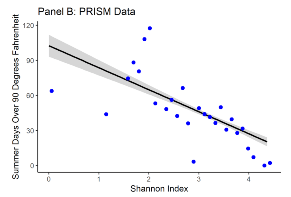 Using street tree data from the California Urban Forest Inventory and daily climate data from PRISM, we found preliminary evidence that street tree diversity mitigates urban heat independent of canopy cover. This work suggests that increasing street tree diversity may be one strategy to help mitigate urban heat, especially in neighborhoods with low canopy cover.